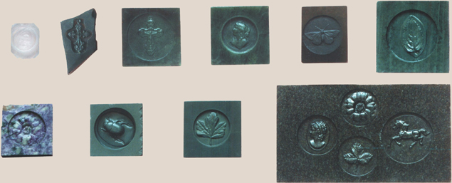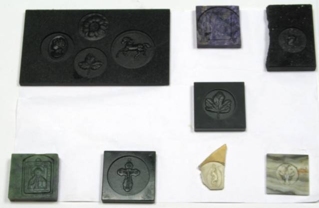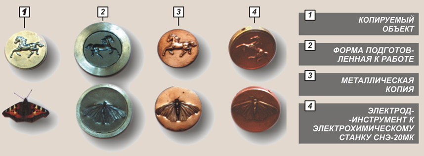 Образцы электрод-инструментов, полученные с применением станков СКФ-50, СНЭ-20МК, СКП-20, СКП-50 и предназначенных для использования в качестве электрод-инструмента в станках СНУ-10 при обработке драгоценных камней и образцы полученных изображений в камне. Точность копирования в камне соответствует оригиналу исходного образца