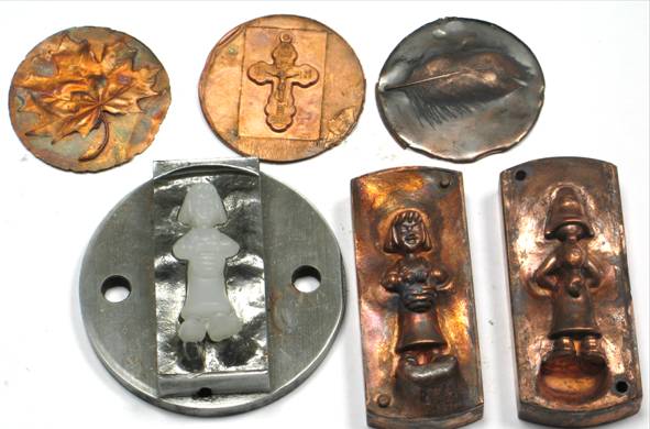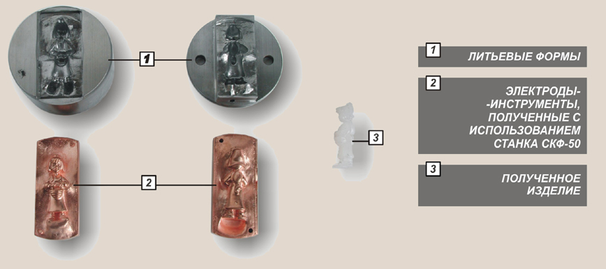 Медные копии изделий, полученные на станке СКФ-50 и предназначенных для использования в качестве электрод-инструмента на станке СНЭ-20МК, СКП-20, СКП-50 Литьевые формы, готовые изделия, полученные с использованием электродов инструментов со станка СКФ-50