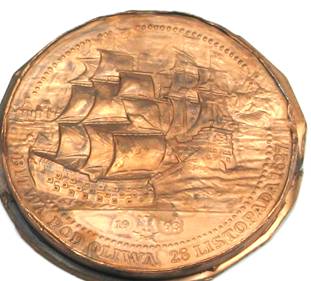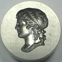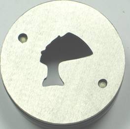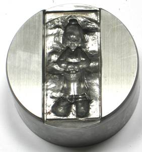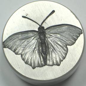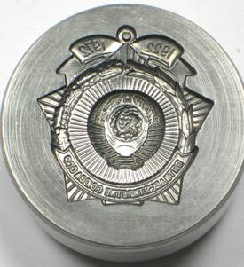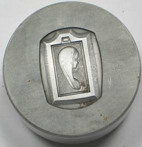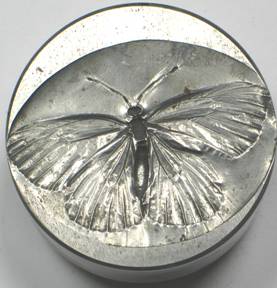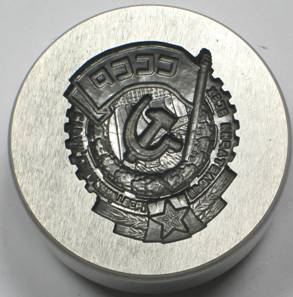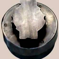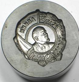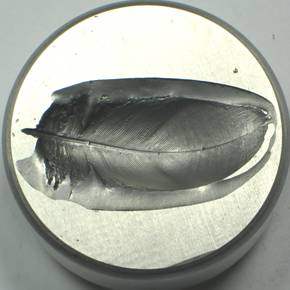 Образец штамповой оснастки, полученный на станке СНЭ-20МК, СКП-20, СКП-50 в закаленной стали твердостью 60 HRCэ с использованием в качестве электрод-инструмента медной копии изделия, полученные на станке СКФ-50 с природного листа