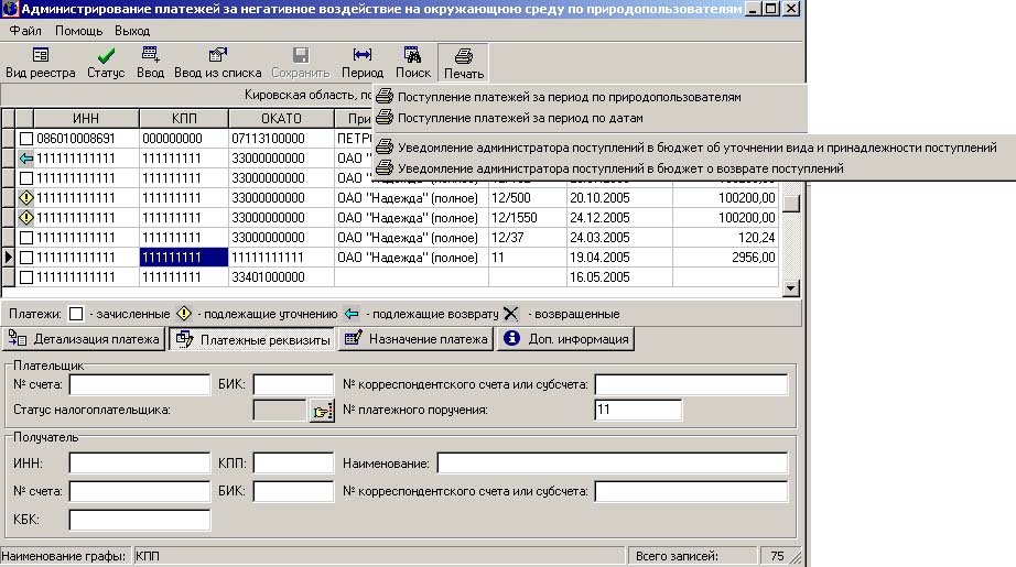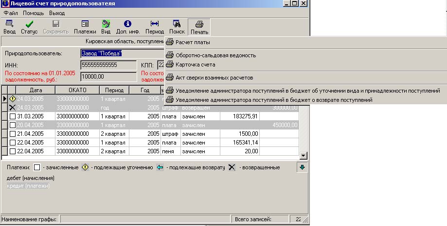 Формирование различных видов отчетов (выходных отчетных форм), регламентированных руководящими документами вышестоящих органов (Ростехнадзор, УФК и др.) таких как форма №1-ПНВ, 1-БФ (Доход)