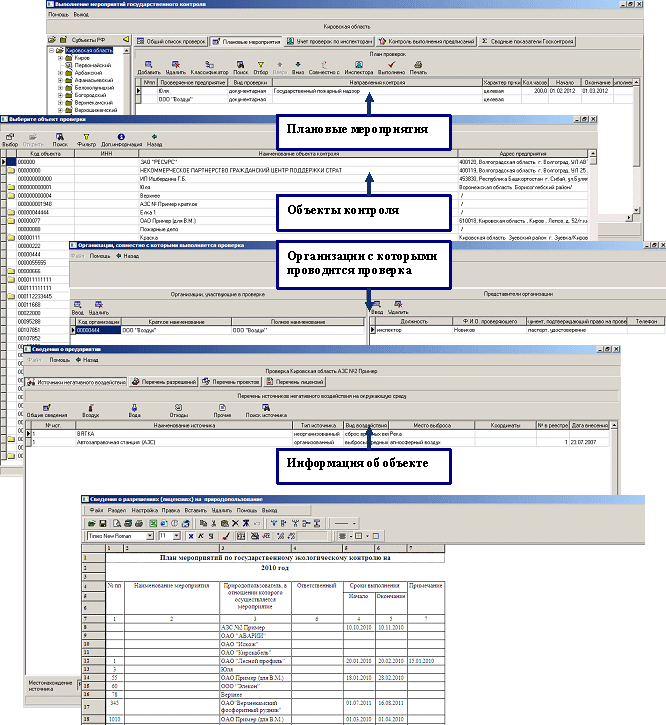 Примеры интерфейса программных модулей "Планирование проверок, контроль выполнения мероприятий по Государственному контролю" программного комплекса ГИАС "Экобезопасность"