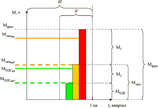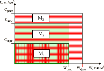 | М2 – | фактический сброс данного загрязняющего вещества за отчетный период в пределах установленного лимита, превышающий установленный норматив допустимого сброса, т/квартал; |