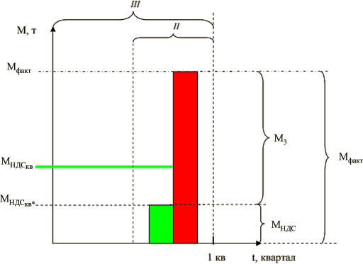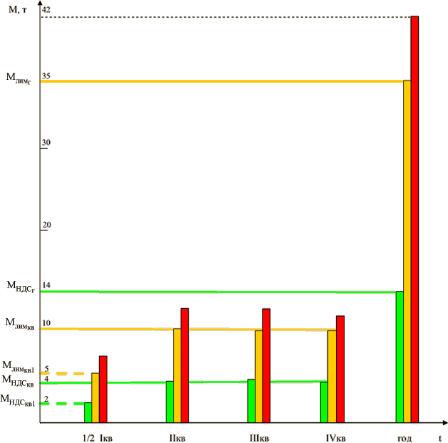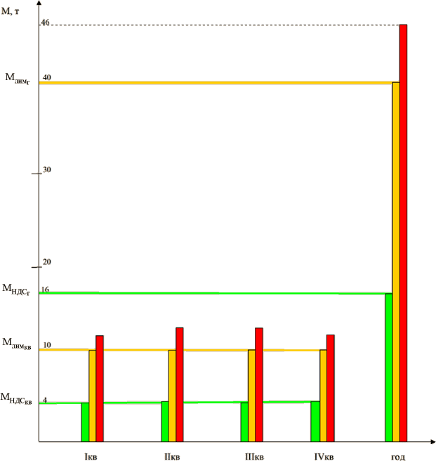 Возможно так же условие неравномерного выброса загрязняющих веществ в атмосферный воздух в течение года, то есть когда годовая величина ПДВ расходуется до окончания отчетного периода. Следует помнить, что величина квартального ПДВ не может быть больше годового ПДВ по разрешению и не должна превышать квартального фактического выброса (рис.4).