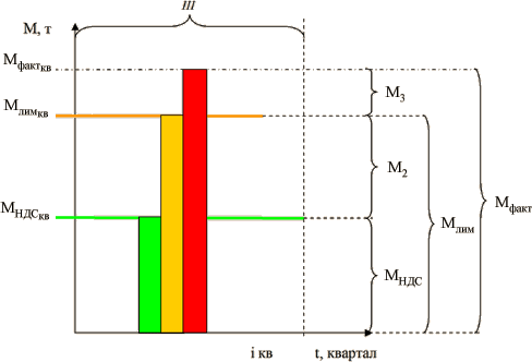 | Млим – | разрешенный сброс загрязняющего вещества в пределах лимита сброса, т/квартал; |