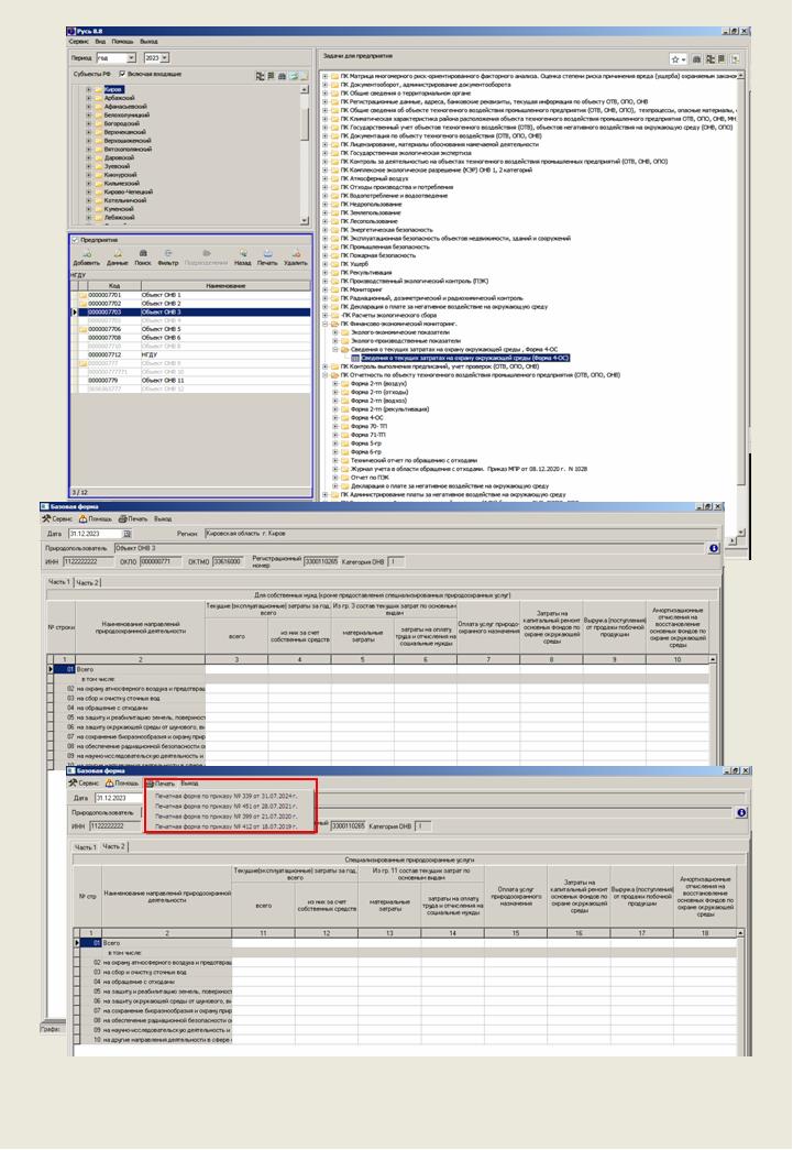ПК "Русь" (Рег. номер ПО №2831, №2833, №2835), ПК ГИАС "Экобезопасность" (Рег. номер ПО №3525)
