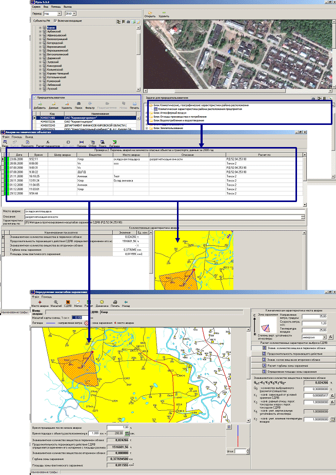 • Отображение расчетов зон возможного заражения аварийно химическим опасным веществом (АХОВ) на картографической основе;