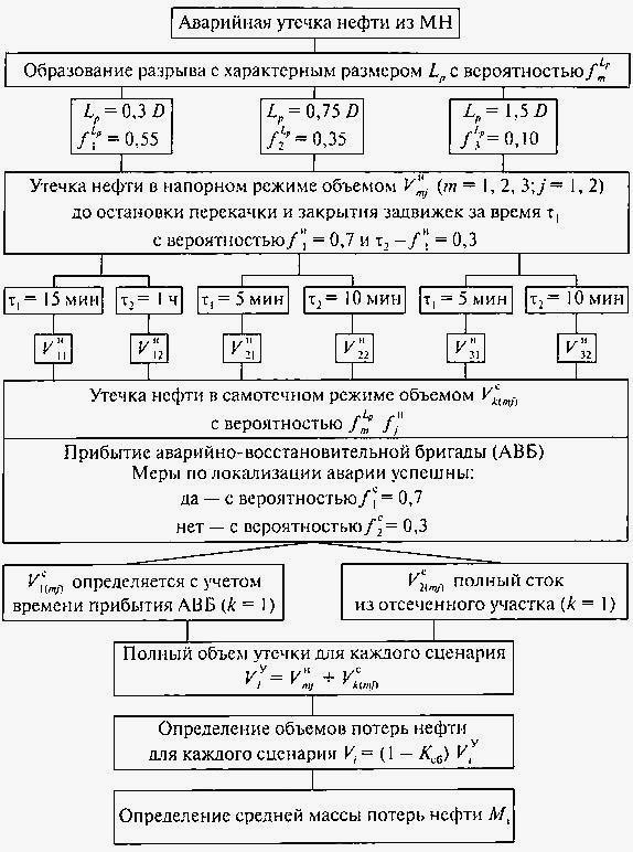 В ПК "РУСЬ" РЕАЛИЗОВАН АЛГОРИТМ РАСЧЕТА АВАРИЙНЫХ УТЕЧЕК НЕФТИ ИЗ МАГИСТРАЛЬНЫХ НЕФТЕПРОВОДОВ И НЕФТЕПРОДУКТОПРОВОДОВ (МН (МНПП)) ("МЕТОДИЧЕСКОЕ РУКОВОДСТВО ПО ОЦЕНКЕ СТЕПЕНИ РИСКА АВАРИЙ НА МАГИСТРАЛЬНЫХ НЕФТЕПРОВОДАХ" ОАО "АК "ТРАНСНЕФТЬ" ОТ 30.12.99 № 152):