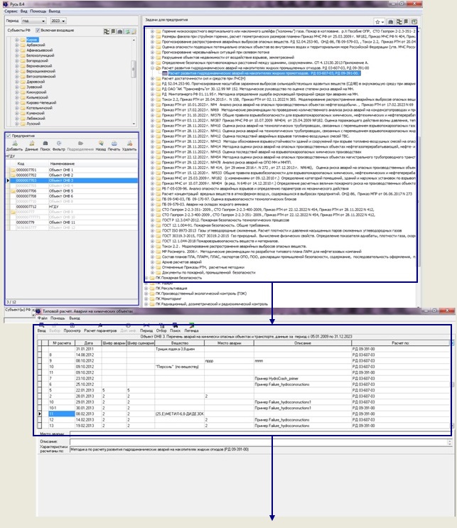 Программный комплекс содержит набор подключаемых прикладных программ, которые реализуют различные расчётные методики по моделированию ударно-волнового, термического, токсического воздействия, рассеяния опасных веществ в атмосфере, позволяют идентифицировать источники опасностей и риск причинения вреда (ущерба) охраняемых законом ценностям, определить характеристики и количество опасных веществ на объекте, определять причины, условия и факторы возникновения аварий, построить сценарии развития аварийной ситуации, следствием наступления которых может стать причинение вреда для охраняемых законом ценностей, оценивать ожидаемую частоту аварий и инцидентов, определить причины , условия, факторы возникновения аварий, рассчитывать интенсивность и объёмы аварийных выбросов опасных веществ для всех расчетных сценариев аварий, оценивать распространение поражающих факторов аварий в окружающей среде для всех расчетных сценариев аварий, определить перечень наиболее опасных составляющих объекта и произвести оценку показателей риска, рассчитывать территориальное распределение потенциального риска, определить коллективный, индивидуальный и социальный риски, оценить возможное число погибших и пострадавших в результате аварий на объекте техногенного воздействия.