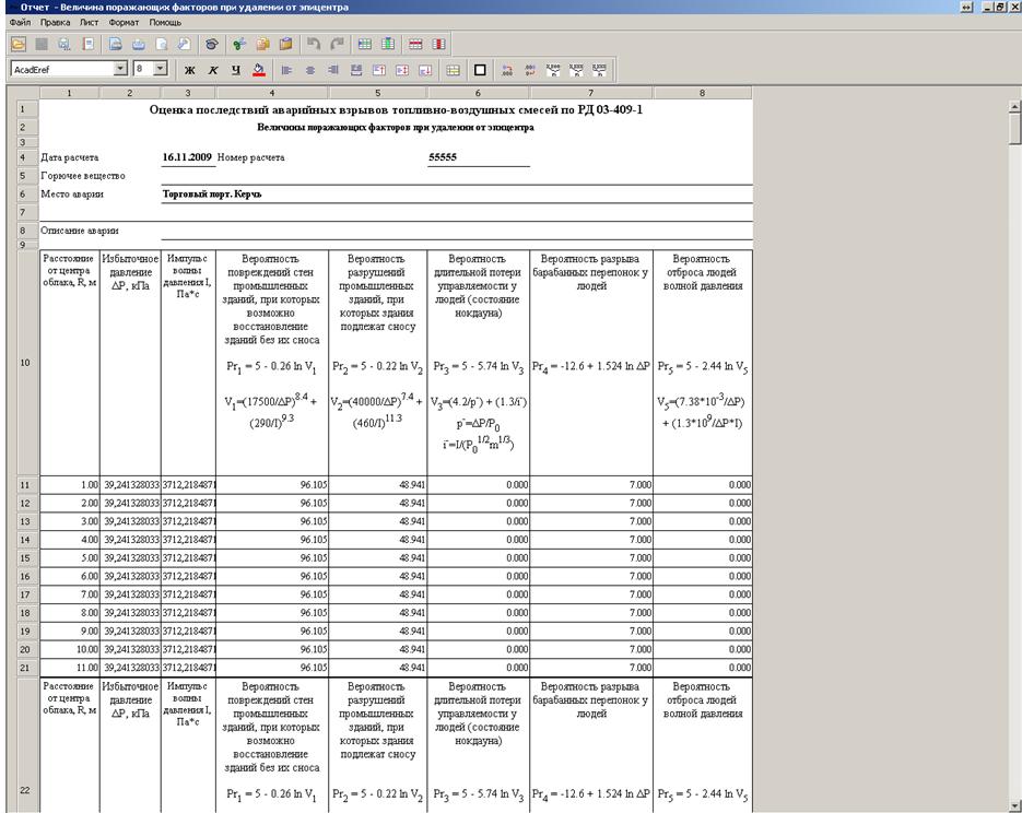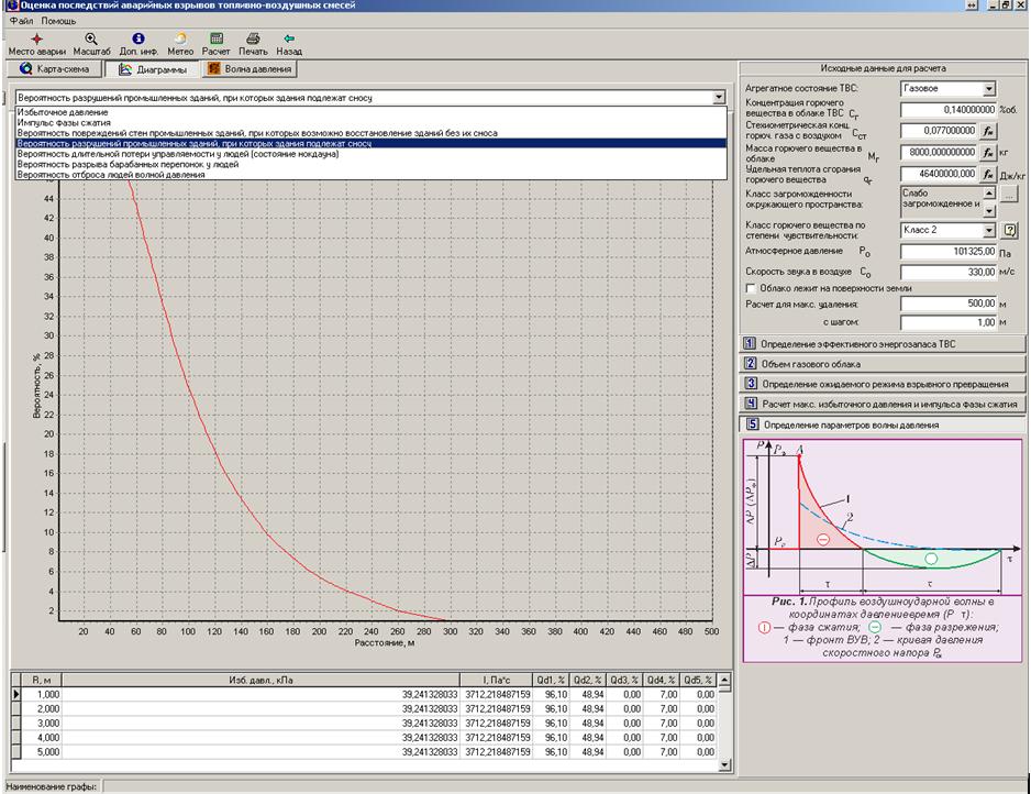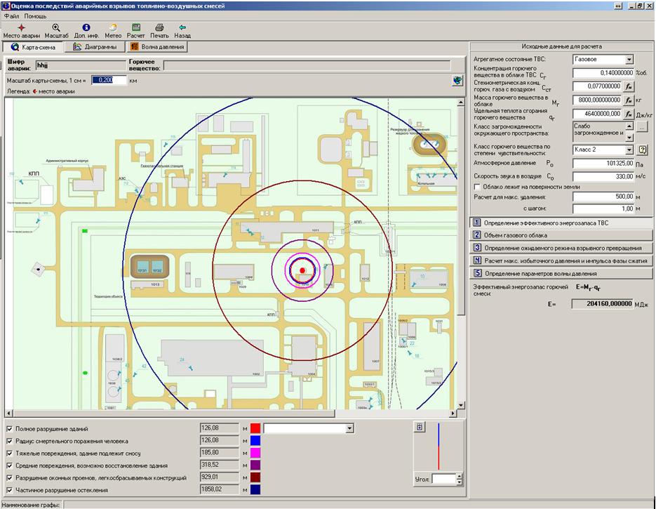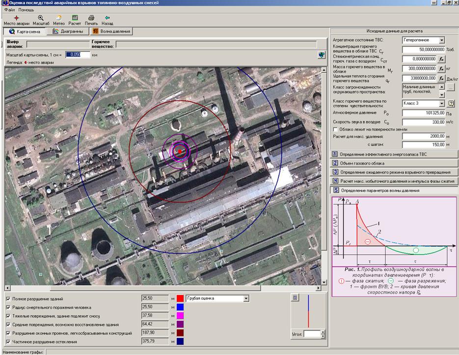 Программа позволяет определить вероятные степени поражения людей и степени повреждения зданий от взрывной нагрузки при авариях со взрывами ТВС