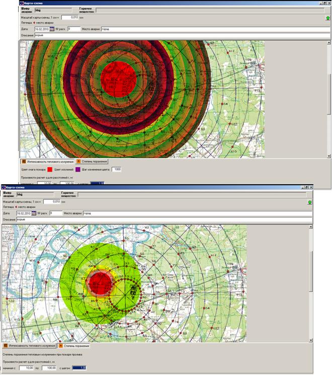 Программный комплекс позволяет визуализировать на ситуационном плане результаты расчётов последствий от воздействия различных поражающих факторов, зоны возможного поражения и построения полей потенциального риска гибели людей.