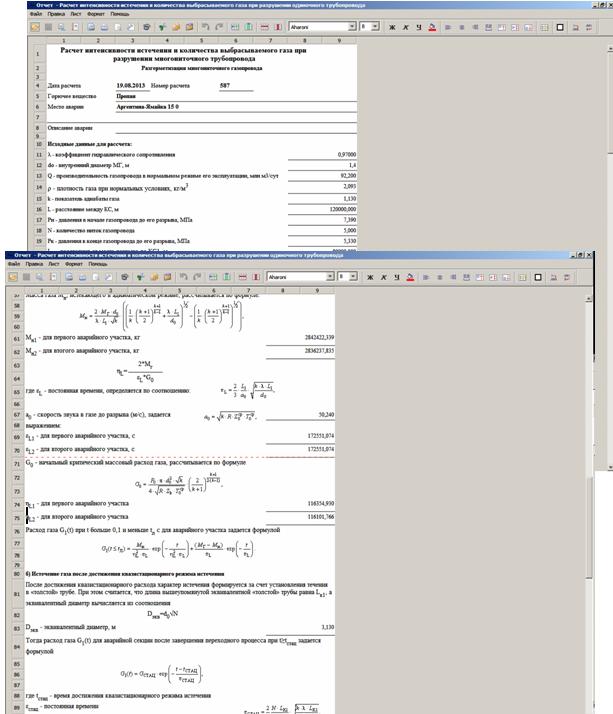 ПРИМЕР ИНТЕРФЕЙСА ПРОГРАММНОГО МОДУЛЯ "РАСЧЕТ ИНТЕНСИВНОСТИ ИСТЕЧЕНИЯ И КОЛИЧЕСТВА ВЫБРАСЫВАЕМОГО ГАЗА ПРИ РАЗРУШЕНИИ МНОГОНИТОЧНОГО ТРУБОПРОВОДА" :