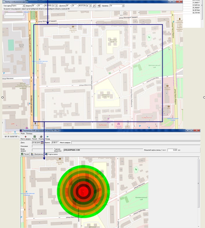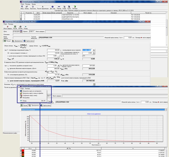 Программный комплекс позволяет визуализировать на ситуационном плане результаты расчётов последствий от воздействия различных поражающих факторов, зоны возможного поражения и построения полей потенциального риска гибели людей.