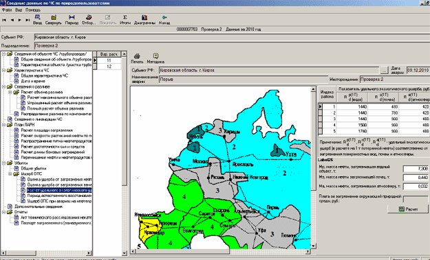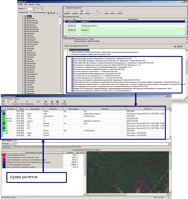 Программный комплекс содержит набор подключаемых прикладных программ, которые реализуют различные расчётные методики по моделированию ударно-волнового, термического, токсического воздействия, рассеяния опасных веществ в атмосфере, позволяют идентифицировать источники опасностей и риск причинения вреда (ущерба) охраняемых законом ценностям, определить характеристики и количество опасных веществ на объекте, определять причины, условия и факторы возникновения аварий, построить сценарии развития аварийной ситуации, следствием наступления которых может стать причинение вреда для охраняемых законом ценностей, оценивать ожидаемую частоту аварий и инцидентов, определить причины , условия, факторы возникновения аварий, рассчитывать интенсивность и объёмы аварийных выбросов опасных веществ для всех расчетных сценариев аварий, оценивать распространение поражающих факторов аварий в окружающей среде для всех расчетных сценариев аварий, определить перечень наиболее опасных составляющих объекта и произвести оценку показателей риска, рассчитывать территориальное распределение потенциального риска, определить коллективный, индивидуальный и социальный риски, оценить возможное число погибших и пострадавших в результате аварий на объекте техногенного воздействия.