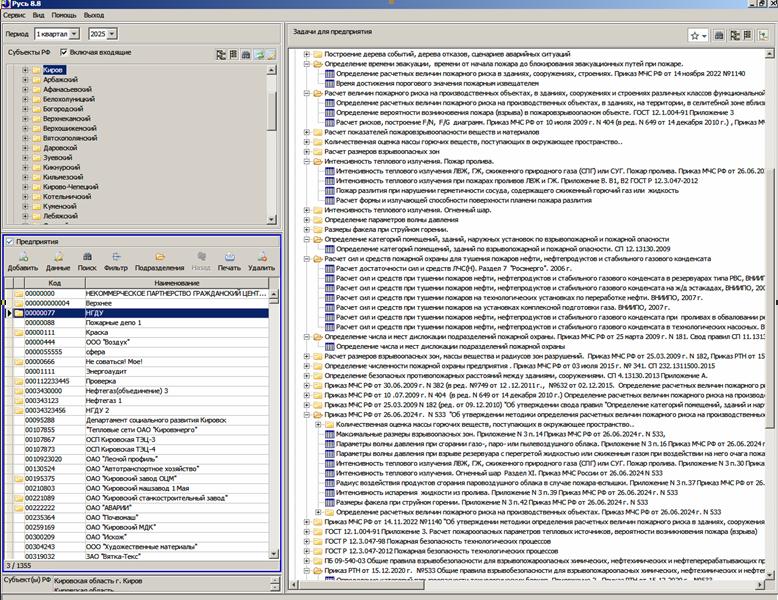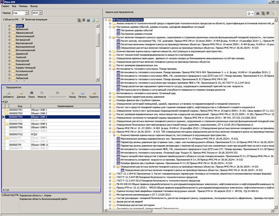 ПК "Русь"- "Вертикально-интегрированная матрица многомерного риск-ориентированного факторного анализа источников риска, профилей риска, определения спектра возможных нежелательных событий, риска причинения вреда, оценки тяжести причинения вреда (ущерба) охраняемым законом ценностям, оценке вероятности наступления негативных событий", ПК ГИАС "Экобезопасность" "Цифровой профиль риска объекта техногенного воздействия"