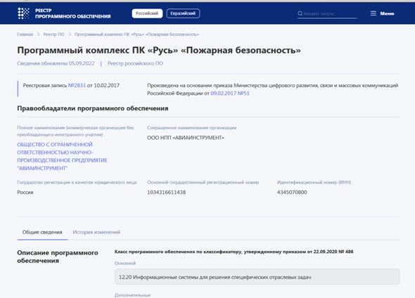 ПК "Русь" "Пожарная безопасность", Рег. номер ПК в едином реестре ПО Минцифры РФ №2831