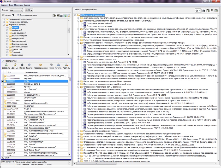 с применением пакета прикладных программ ПК "Русь" "Пожарная безопасность", Рег. номер ПК в едином реестре ПО Минцифры РФ №2831, последовательности оценки вероятности наступления негативных событий, следствием наступления которых может стать причинение вреда для охраняемых законом ценностей (ст.22, ст.23 248-ФЗ), расчет условных вероятностей поражения людей, оценки условных вероятностей реализации расчетных сценариев аварий, выбора и обоснования основных (расчетных) сценариев аварий из числа возможных сценариев, потенциальных источников опасности технологической среды, оценки массы пожаро-, взрывоопасных веществ, поступающих в окружающее пространство, свойств природного газа с учетом состава смеси газа и объемной доли компонентов смеси, проведения оценки взрыво-, пожаро- опасности зданий и сооружений, определение категорий наружных установок по взрыво-, пожаро- опасности, последствий аварийных выбросов пожаро-, взрыво- опасных веществ, материалов, проведения расчета показателей риска производственных объектов, наружных установок, ОПО, ОНВ, МН и МНПП, территории зоны воздействия, построения полей потенциального риска, с учетом неограниченного количество источников опасности, сценариев аварийных ситуаций, расчета потенциального, индивидуального, социального, коллективного риска с применением программных комплексов