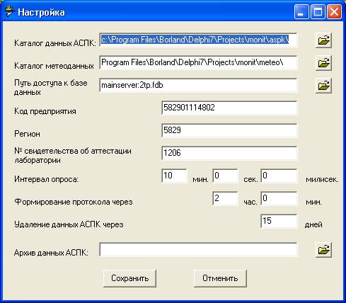 Пункт меню «Настройка» позволяет выполнить настройку текущей конфигурации программы. При выборе этого пункта открывается следующее окно: