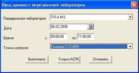 - выполнить. При выборе пункта меню «Выполнить» открывается окно ввода данных передвижных лабораторий.