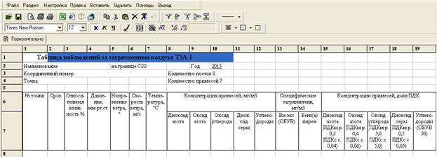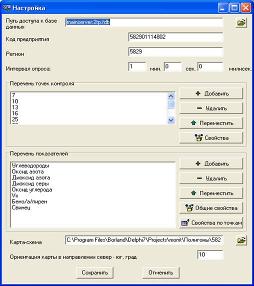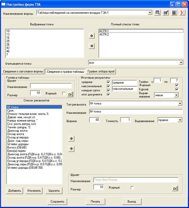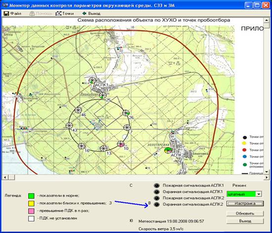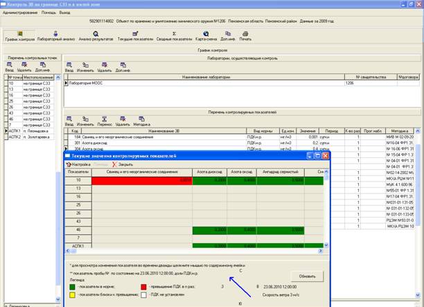Перечень точек контроля и предельно допустимые значения показателей берутся программой из графика контроля, а метеорологические характеристики из климатического мониторинга.