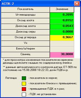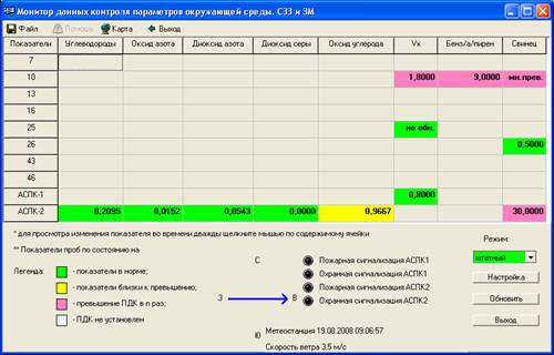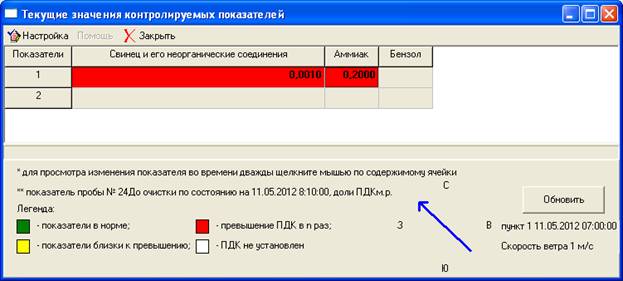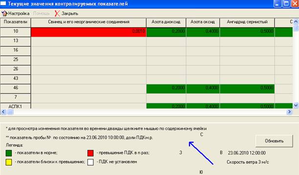 В центральной части экрана расположена таблица показателей окружающей среды. Столбцы предназначены для отображения названий загрязняющих веществ, строки – для отображения точек пробоотбора. На пересечении строк и столбцов в ячейках таблицы отображаются текущие значения показателей в долях от норматива. Перечень контролируемых показателей, точки пробоотбора, источник данных для каждой ячейки, а также норматив, с которым сравниваются текущие значения, задаются настройкой.