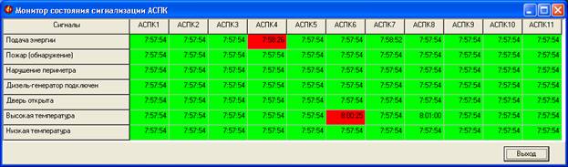 Столбцы таблицы отображают наименования объектов контроля пожарно-охранной сигнализации. Строки таблицы отображают наименование датчиков. На пересечении строк и столбцов цветом отображается состояние датчиков: зеленый цвет нормальное состояние; красный цвет – сработка сигнализации. В поле ячейки записывается время изменения состояния датчика.