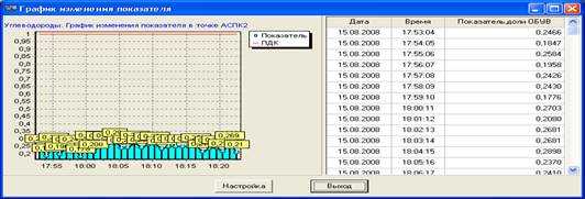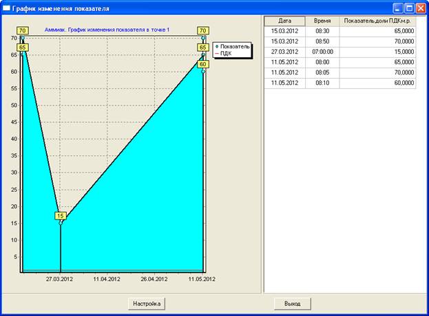 Например, для контроля содержания ЗВ в газовоздушных смесях, отходящих от источников выбросов, проверяется концентрация свинца и его неорганических соединений и аммиака. В графах таблицы указываются предельно допустимые значения. Для просмотра изменений показателей по времени следует дважды щелкнуть мышью по содержимому ячейки и открыть окно «График изменения показателя»: