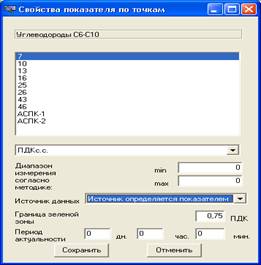 В верхней части окна выбирается точка пробоотбора. Могут быть уточенены для каждой точки такие показатели, как источник данных, граница «зеленой» зоны и период актуальности. Кроме того, могут быть указаны дополнительные параметры.