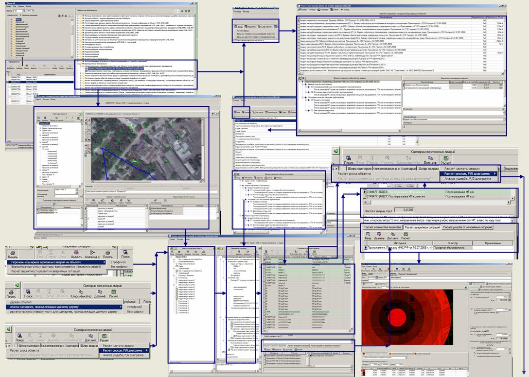 расчет индивидуального, потенциального, социального, коллективного риска, построение полей потенциального риска, расчет ущерба, построение F/N, F/G диаграмм и формирование других документов в соответствии с требованиями НПД, как по отдельным объектам капитального строительства, так и (или) другим объектам, а также их совокупности, объединенных единым назначением и (или) неразрывно связанных физически или технологически и расположенных в пределах одного или нескольких земельных участков, так и по предприятию, компании в целом, создание систем СППР, СЭМ, автоматизированные системы управления (АСУ) по ISO 14001, обеспечить прием-передачу информации в ХМL-формате, обеспечение промышленной, пожарной, эксплуатационной, энергетической, технологической, экологической безопасности, охраны окружающей среды,