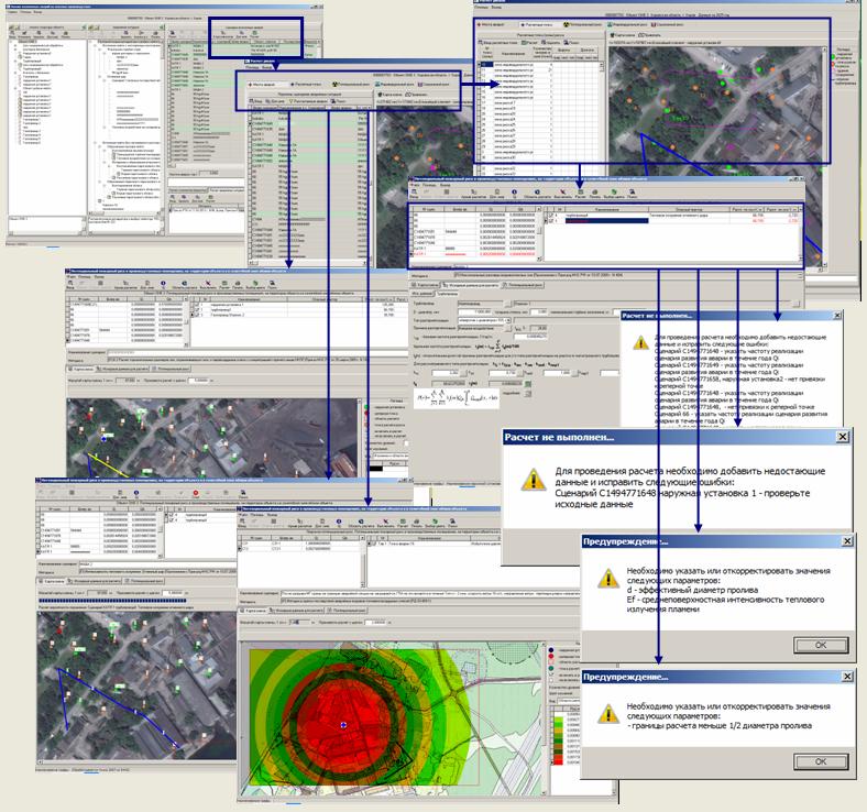 расчет индивидуального, потенциального, социального, коллективного риска, построение полей потенциального риска, с учетом как неограниченного количество источников опасности, так и сценариев, шифров аварийных ситуаций,