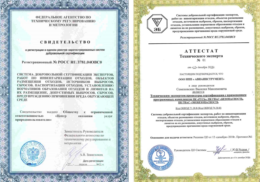 | Система добровольной сертификации экспертов, работ по инвентаризации отходов, объектов размещения отходов, источников выбросов, сбросов, паспортизации отходов, установлению нормативов образования отходов и лимитов на их размещение, допустимых выбросов, сбросов, предупреждению причинения вреда окружающей среде. Свидетельство № РОСС RU.3781.04ОBC0 |