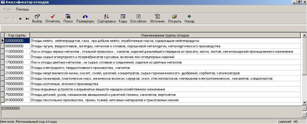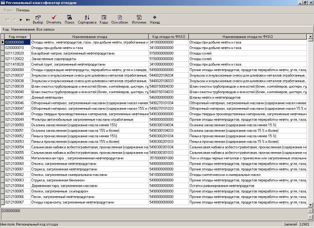 При нажатии кнопки "Ввод" появится региональный классификатор отходов: