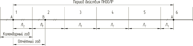 | / – | период от начала первого календарного года (1) до начала действия лимита на захоронение отходов (А); |