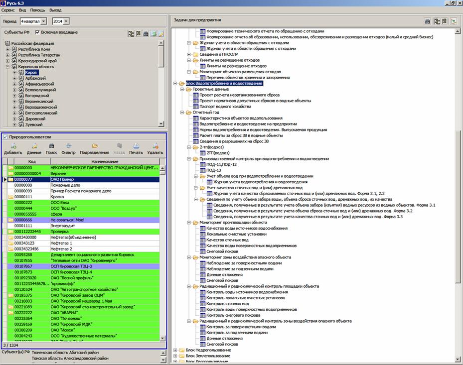 ПК "Русь" "Водопотребление и водоотведение" имеет блочную структуру, каждый блок может функционировать как отдельно, так и собираться в необходимые конфигурации и может поставляться в любом составе.При этом базы данных, введенные в программные модули сохраняются и не зависят от времени поставки последующих дополнительных блоков т.е. не зависят от поставки дополнительных блоков. Базы данных построены на единой классификационной основе т.е. пользователь может заказать и работать в каком то отдельном программном модуле и в случае добавления в последующем дополнительных модулей, блоков ему не надо повторно вводить данные по предприятию. При этом базы данных сохраняются по годам и и привязаны к конкретным производственным площадкам, обособленным подразделениям, опасным объектам, объектам негативного воздействия на окружающую среду (ОНВ), расположенных на конкретных территориях (ОКАТО, ОКТМО).